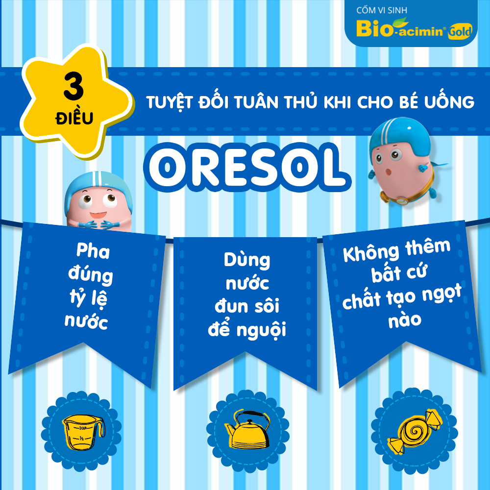 Bù nước cho trẻ: Ngay khi trẻ bị tiêu chảy, mẹ cần cho bé uống oresol để bù lại lượng nước và các chất điện giải đã mất qua phân. Khi cho bé uống oresol, mẹ phải pha và sử dụng theo hướng dẫn ghi trên bao bì. Dung dịch sau 24 giờ nếu trẻ không uống hết thì đổ đi và pha đợt mới. Bên cạnh đó, mẹ có thể cho trẻ bị tiêu chảy uống thêm các loại nước khác như nước đun sôi để nguội, nước canh, nước cháo, nước dừa tươi…