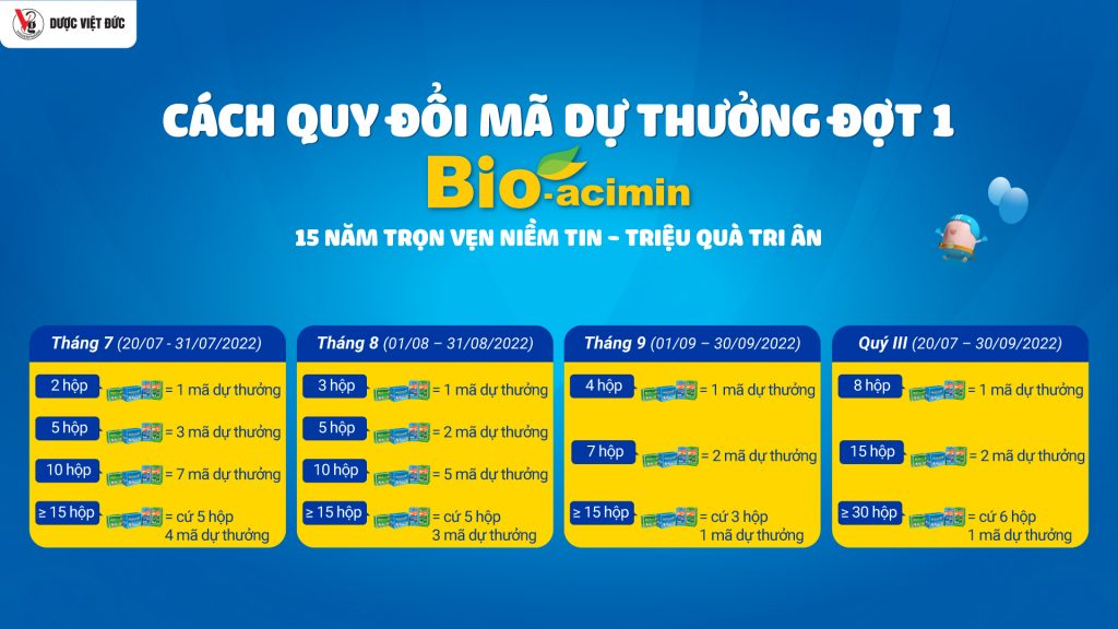 “BIO-ACIMIN 15 NĂM TRỌN NIỀM TIN – TRIỆU QUÀ TRI ÂN” là chương trình khuyến mãi do nhãn hàng Bio-acimin triển khai từ ngày 20/07/2022 đến ngày 31/12/2022. Cụ thể khi Quý khách hàng mua các sản phẩm thuộc nhóm Bio-acimin sẽ được cộng dồn số lượng số lượng sản phẩm mua theo tháng để nhận mã số dự thưởng tương ứng từng tháng và có cơ hội rinh ngay những phần thưởng giá trị với tổng giá trị lên tới hàng tỷ đồng.